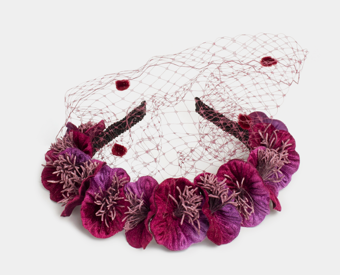 Entre los más discretos destaca la diadema Mónica (99 euros) de flores de terciopelo y velo con rejilla, que está disponible en color negro y morado.