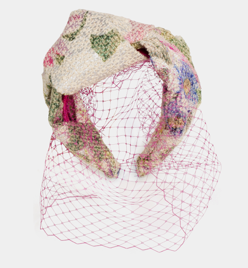 Y acabamos con otra opción bastante discreta si te animas a lucir el tocado con rejilla, la diadema Valentina (99 euros), forrada con una tela multicolor tipo Chanel que incluye un velo de rejilla en color rosa.