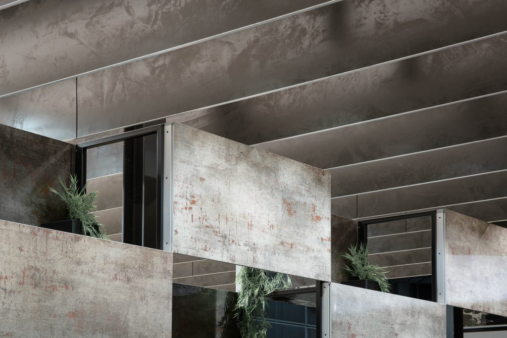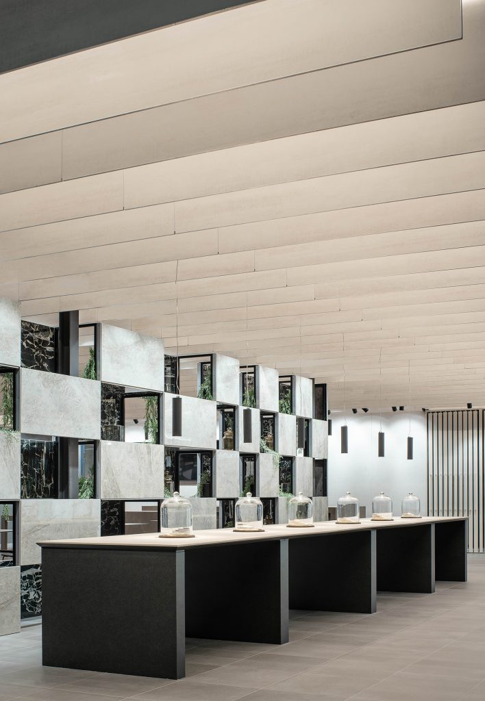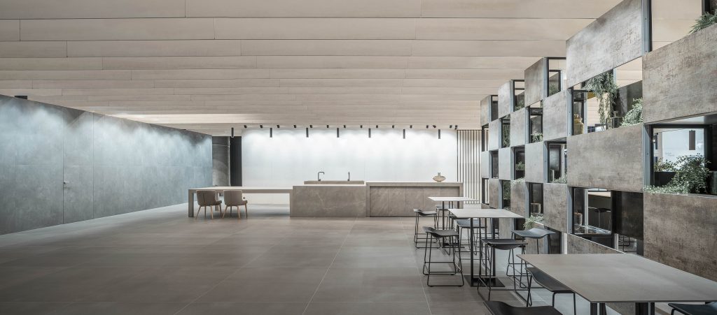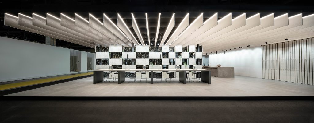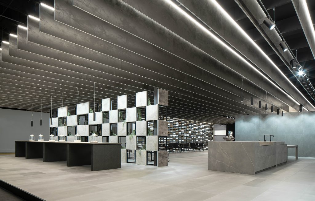 De esta forma, el Stand queda definido y caracterizado por una cubierta que acota el espacio. Un tamiz de lamas cerámicas suspendidas que parecen desafiar las leyes de la gravedad y cuya disposición ortogonal y repetitiva prolonga la sensación de apertura y continuidad del stand.