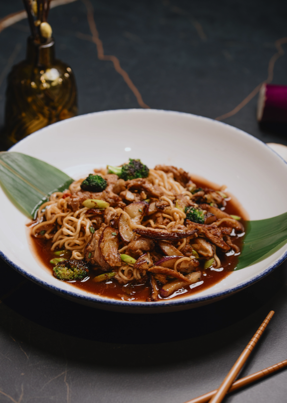 Noodles de cordero de pastoreo y verduras salteadas