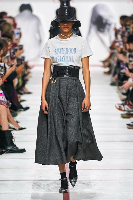 En esta colección de Dior perdura la esencia sofisticada de la casa, y proponen looks con mensajes de reivindicación feminista, sombreros, prendas acolchadas, faldas largas de tul (un clásico en la marca), estampados de cuadros por doquier, negro, negro y más negro, y trajes de todo tipo adaptados a la figura femenina.