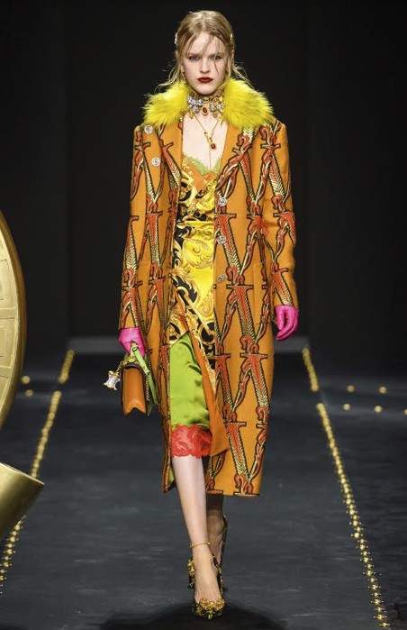 Combinación de estampados rococó al más puro estilo personal de la marca, el color naranja, arneses, tonos flúor en prendas de vestir y complementos, combinaciones de muchos colores en un mismo look, brilli brilli, trajes masculinos, tejido lencero y mucho dorado.